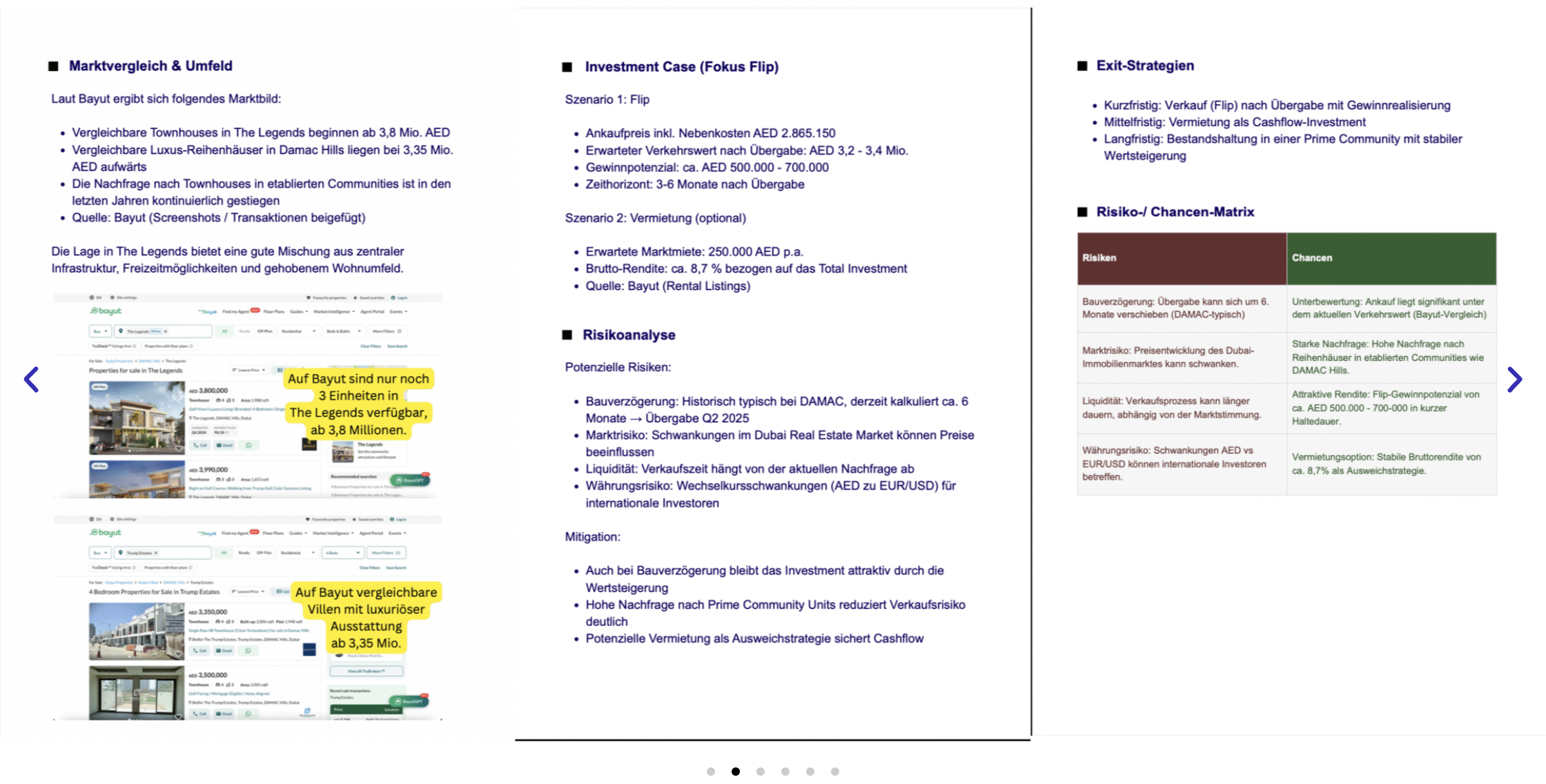 • Flip nach Übergabe: Verkauf zu 3,2–3,4 Mio. AED → Gewinn 500.000–700.000 AED